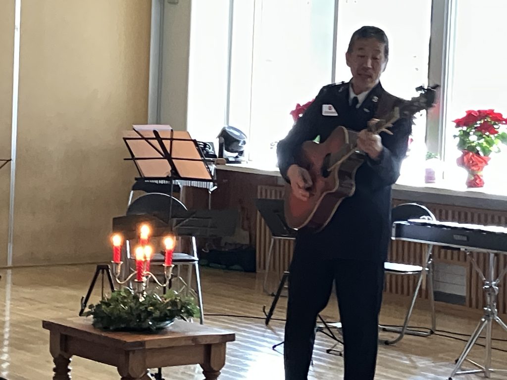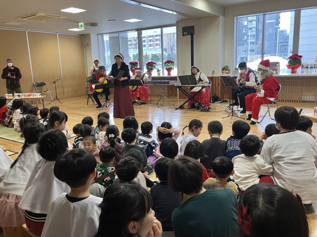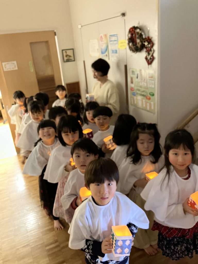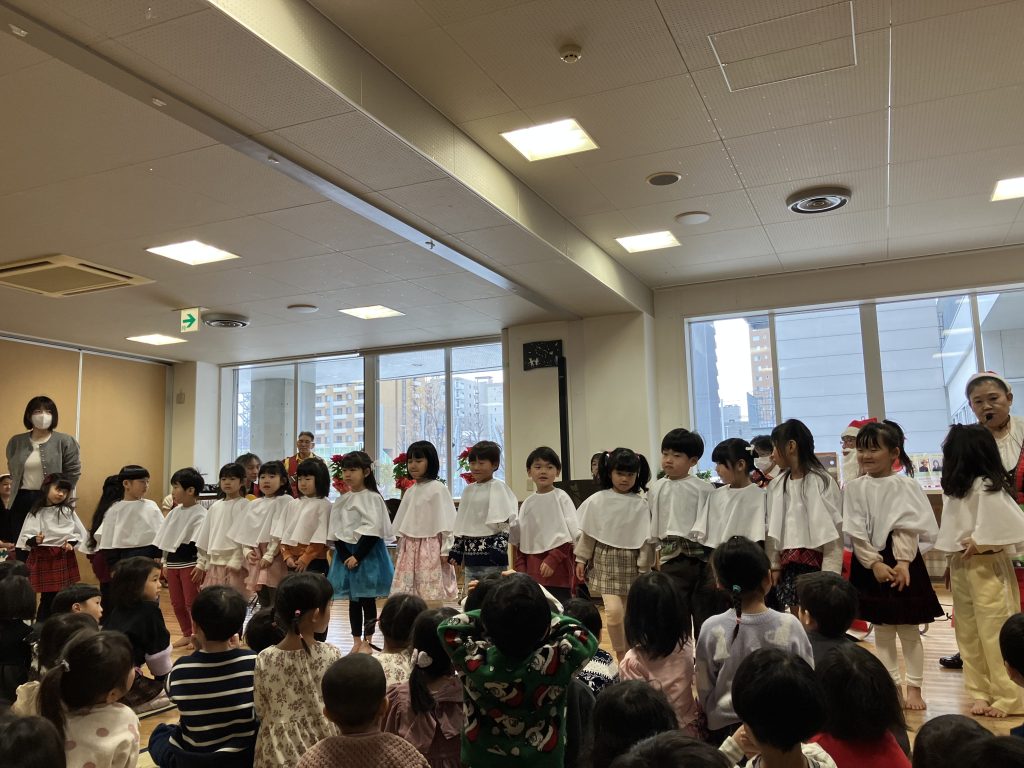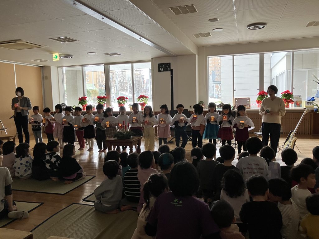 1部は年長のキャンドルサービス・礼拝 2部はハート音楽院アンサンブルの楽器演奏があり、年長児が切り絵を貼った牛乳パックの切り絵のキャンドルがとても素敵でした。クリスマスイブになりアドべントキャンドルがすべて灯され会が進行していきます。みんなの知っているクリスマスソングが演奏され一気にムードは高まっていきます。ハート音楽院の演奏でも手拍子をしながら一緒に歌う子もいましたよ。会が終わっても昼食はピラフや唐揚げのごちそう、午睡明けはサンタさんからのプレゼントが届き、一日中楽しみがいっぱいのクリスマス会でした。