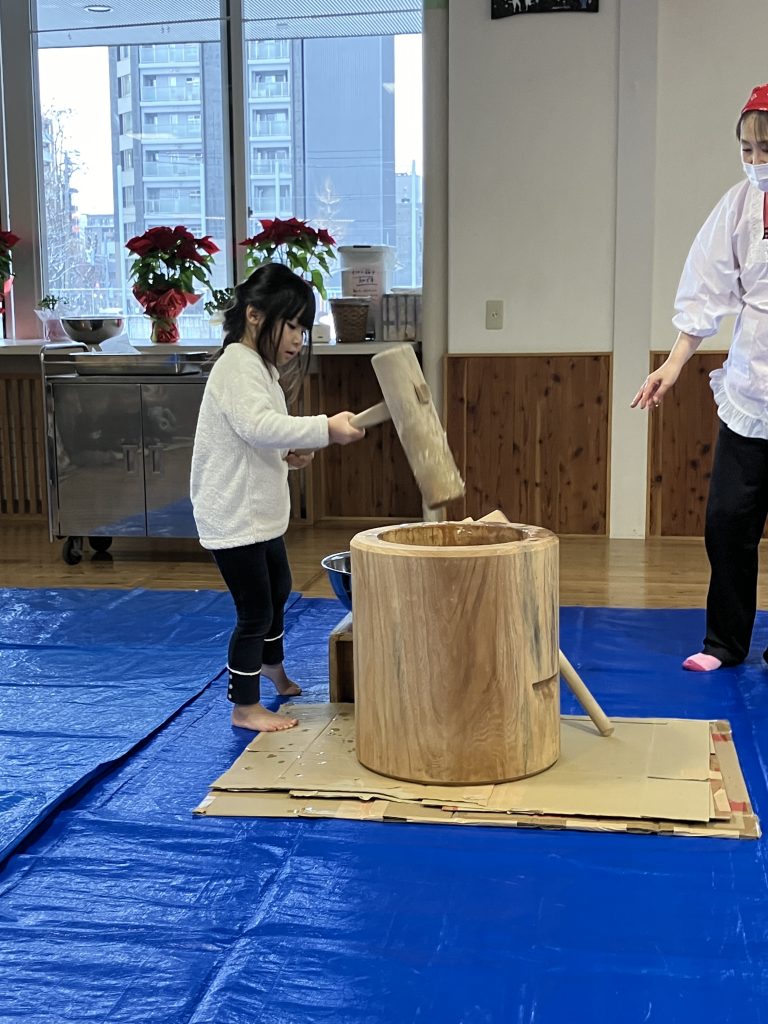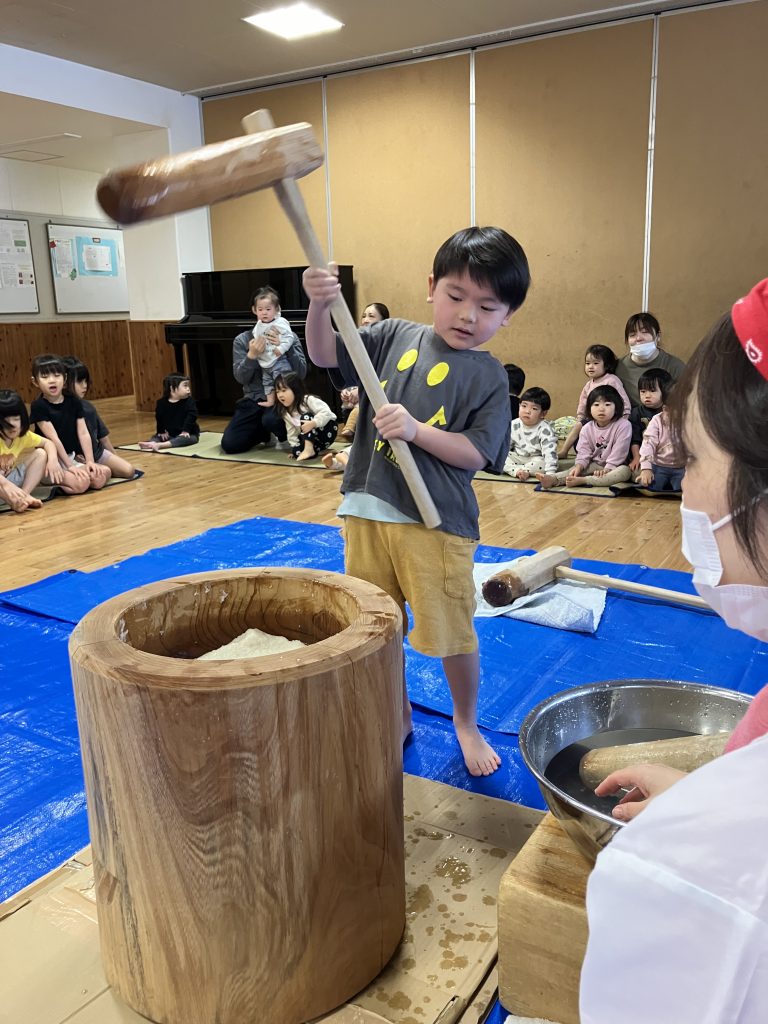 年越しに備えてもちつきをしました。今年もミニ児童会館に来ていた1年生も園児とともにもちつきに参加しました。蒸かしたてのもち米のにおいや、餅をつく前の状態を見たことのない子はじっくりと覗き込んでみていましたよ。まずは年長が1人づつ「ヨイショー!」の掛け声に合わせ杵を握り、餅をつきます。思っていたよりも杵が重たくてよろめきそうな場面もありましたが、17人いるのでだんだんともち米の粒が潰れてきて餅に近づき、杵にくっつくようになってきました。次は見に来ていたミニ児童会館の1年生がつきます。卒園児は昨年ついたことがあるのですが、初めての子は「とても楽しかった」と言い、嬉しそうな表情でしたよ。つきあがった餅は鏡餅にして玄関と2階のラウンジに飾っていますぜひ見てみてくださいね。立派で大きな鏡餅ができ、良い年を迎えられそうです。